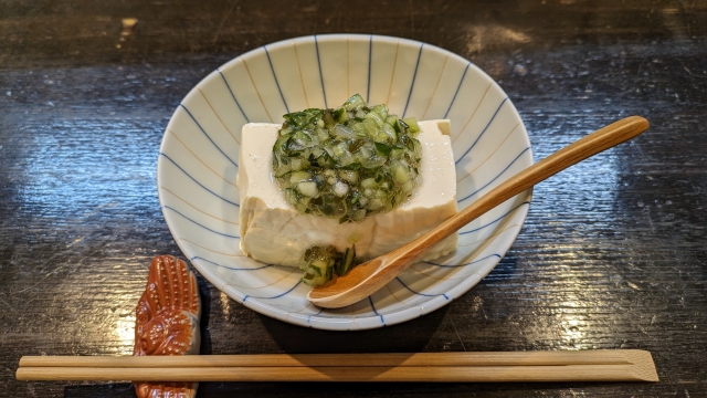 9)お皿に豆腐を並べ、その上に大葉を盛ります。